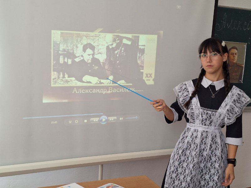 30 сентября 2025 года учитель истории МБОУ «Дрофинская СОШ» Куртэюпова Л.Э. провела в 9, 11 классах тематические уроки «Дело всей жизни», посвященные 130-летию со дня рождения выдающегося полководца Великой Отечественной войны, Дважды Героя Советского Союза, Маршала Советского Союза А.М. Василевского.